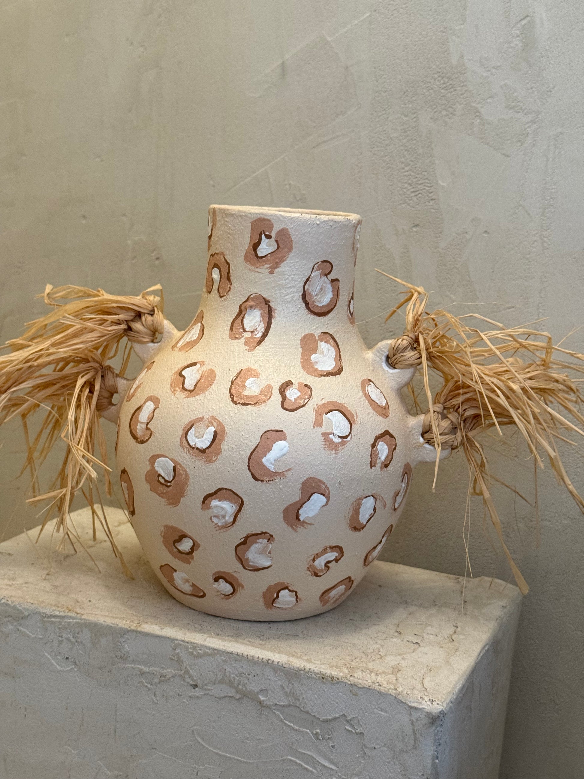 Façonné à la main en terre cuite naturelle, ce vase se distingue par ses motifs peints à la main et ses anses ornées de fibres naturelles. Chaque pièce est unique, reflet d'un artisanat raffiné et authentique.
